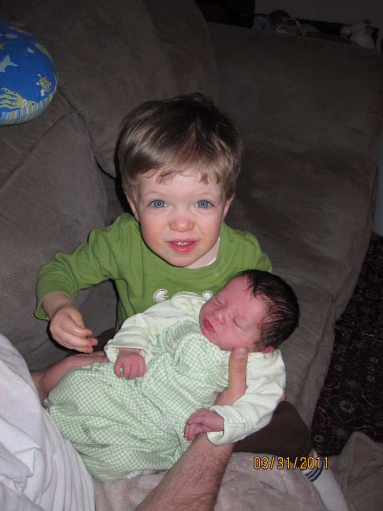 Finn accepts that sometimes what he needs has to wait until Eamon gets what he needs.  I think it helps that sometimes Eamon has to wait for Finn’s needs to be met too.  He likes to tell people Eamon’s name, and that he is his “brudder.”  We’ve tried, wherever possible, to integrate Eamon into Finn’s routines, and not the other way around.  Finn has accepted the changes to his routine with ease – he likes to be read to during Eamon’s feeding sessions, and we’ve made Eamon’s bath time after Finn’s bed time (I think Finn would be a little too eager to “help”).  Eamon helps put Finn to bed, and they always share a bedtime kiss.