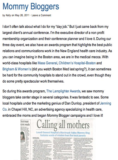 Our mommy bloggers were recently featured on the blog, Tidbits. Written by Kelly – a mom of two boys – she shares her experience at one her largest client’s annual conference. During the three day event, they had an awards program that highlights the best public relations and communications work in the New England health care industry. It was during this awards program, the Lamplighter Awards, that she saw our mommy bloggers – as well as others – take center stage in several categories!