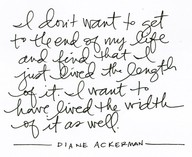 I was killing some time on the internet the other day when I came upon an amazing quote by Diane Ackerman, “I don’t want to get to the end of my life and find that I have just lived the length of it. I want to have lived the width of it as well.”  It really stopped me in my tracks.  The width of one’s life?