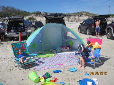 - A Shelter of Some Sort – We use a three-sided tent purchased at the Christmas Tree Shops. Not only is it important to protect your skin from too much sun, especially for the little ones, but we just burn much too easily in our family. Depending on how “distractible” your little one is, you might even be able to use this space to encourage an afternoon nap on the beach. It’s also great to have a shady location to put your cooler, your sunblock, and anything else you don’t want getting too heated up.
