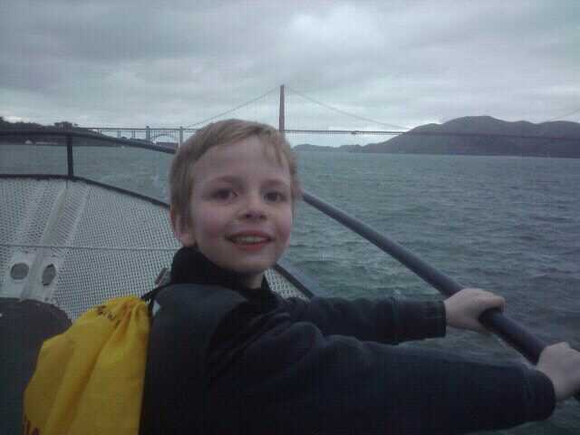 We hopped the Cable Car and rode to Pier 39, a tourist attraction of shopping and restaurants, similar to Faneuil Hall in Boston.  From there, we took an hour-long ferry tour of the Bay.  The boat had both indoor and outdoor space and chugged out under the Golden Gate Bridge, past the famous sea lions and around Alcatraz with a narrated tour pointing out the other sights on the skyline of the city and surrounding areas.  Andrew was jumping up and down with excitement despite the cool and misty weather.  At one point, I was actually concerned he might fall off (I know, a mom moment) and made his brother go stand next to him.