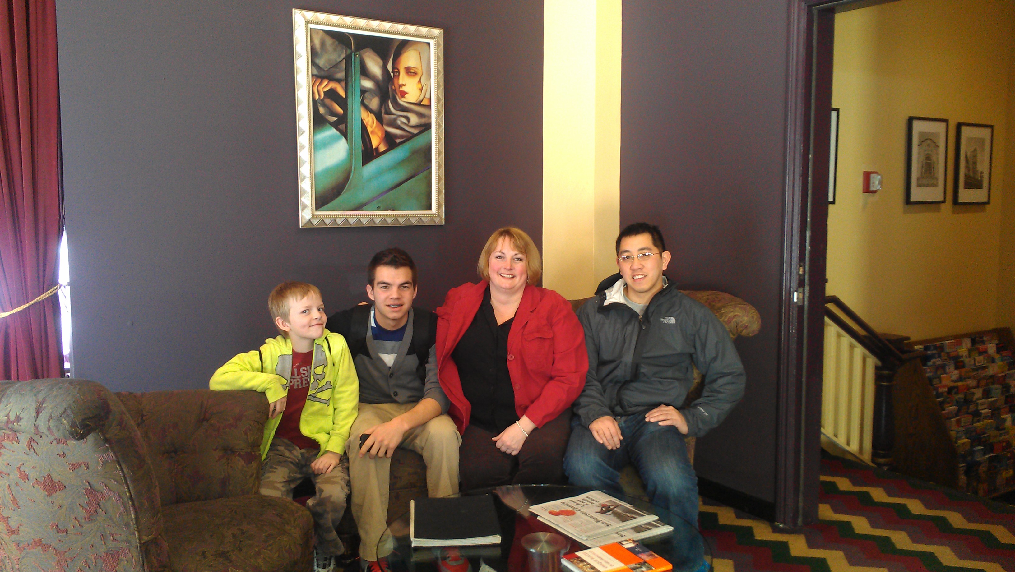 After some diligent research, I found a hotel for less than $100 per night for the four of us right near Union Square on Hotelopia.  The Hotel Bijou had a movie theme, so each room was named after a movie made in or about San Francisco and movie-themed pictures hung on the walls.  It even had a small (9-seat) movie theater off the lobby that showed movies at 7 and 9:30 each night.  While it bordered on the seedier Tenderloin district, it was also only a block from the Powell Street Cable Car turnaround, the BART entrance, the bus and trolley lines, and tons of shopping.  We felt completely safe, but we are all frequent travelers (and some of us past residents) to large cities.  People who are not used to seeing homeless people might be more put off by the city in that respect.