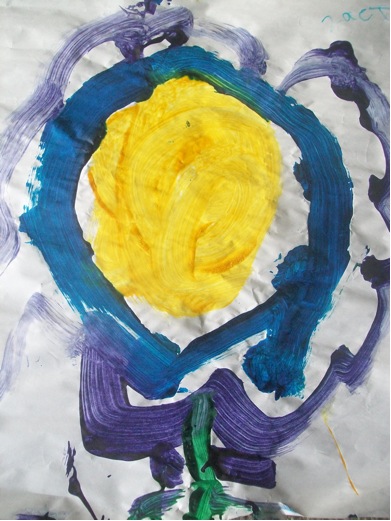 Several days later my son brought his work home from school in his backpack, and in it were all kinds of treasures: a paper kite, tracings of the letter of the week and some rolled up artwork. Every week he comes home with artwork. One of the free time areas in his classroom contains an art easel and he loves it. Here is what he came home with: