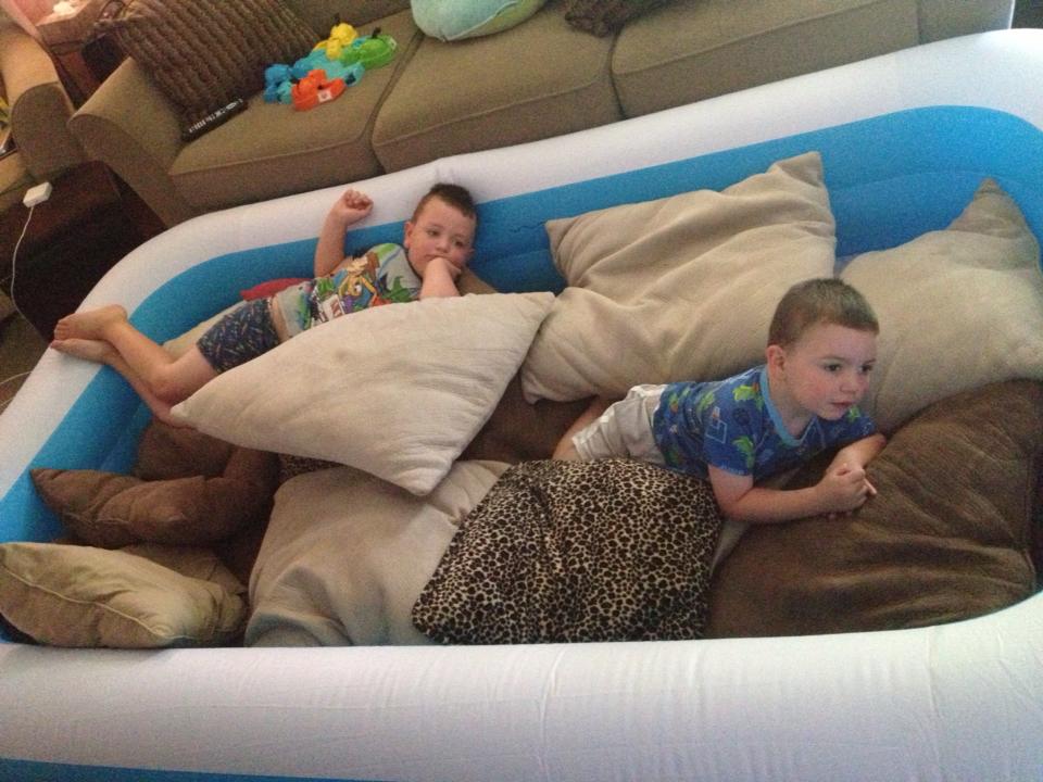 One of the greatest ideas I got from Pinterest was filling an inflatable pool with pillows and blankets, and enjoying some relaxation time. Now, with boys who are 2 and 5, there’s no such thing as real “relaxation time” – but boy did we have fun! I purchased a $20 inflatable pool from a local discount store and filled it with pillows from various old couches. At first, the boys had no idea what I was doing, but when they realized that this was a pool for them to play in, they squealed with delight. We filled it with every pillow in the house and they piled in blankets and favorite stuffed animals. I had to place some “safety” guidelines for getting into the pool, and soon they were jumping and piling pillows that were higher than they were tall. We snuggled up and watched movies, and they begged to sleep in the “Pillow Pool” that night. How could I say no? They had so much fun! I hope it’s one of those memories they cherish from their childhood.