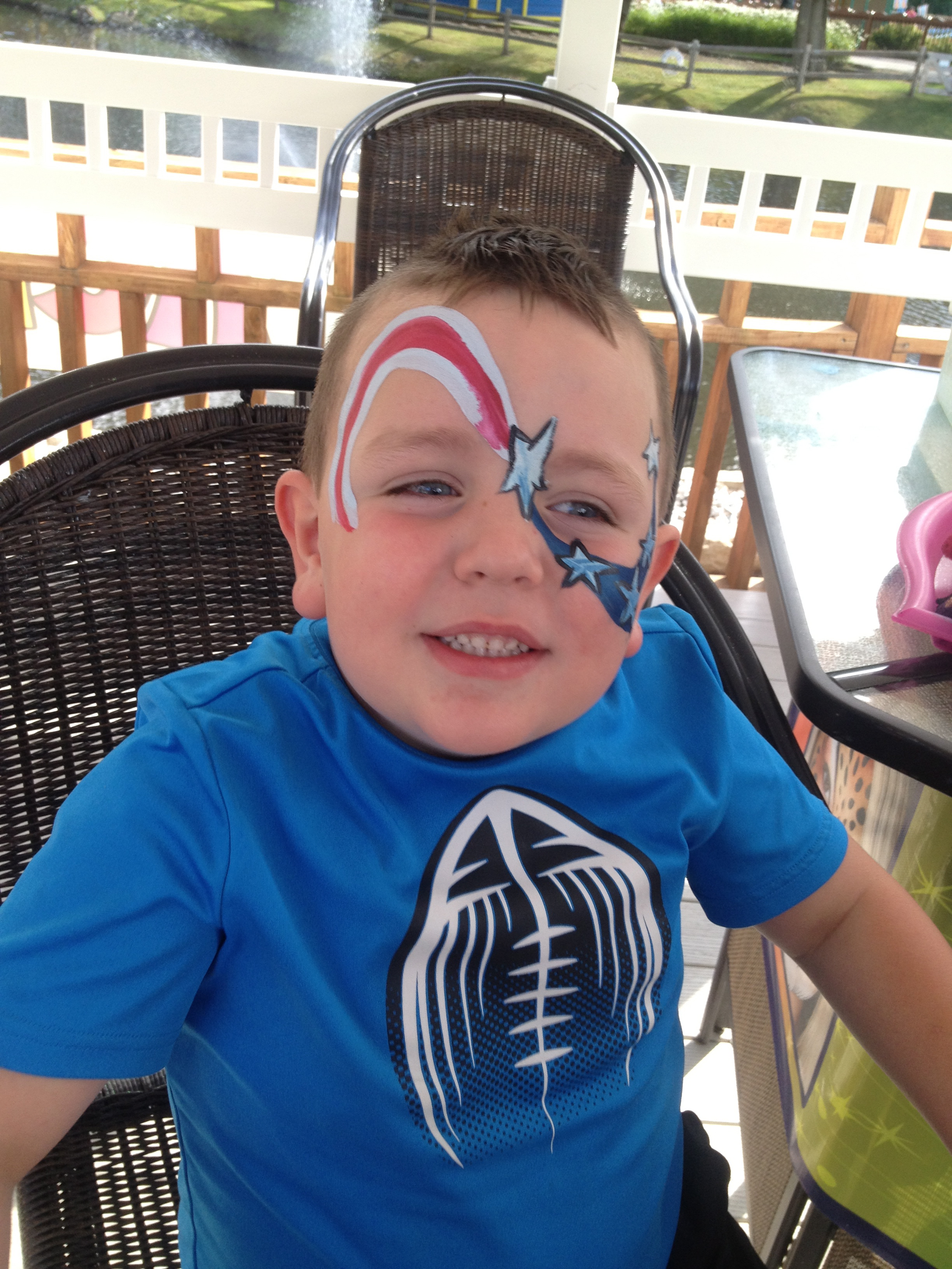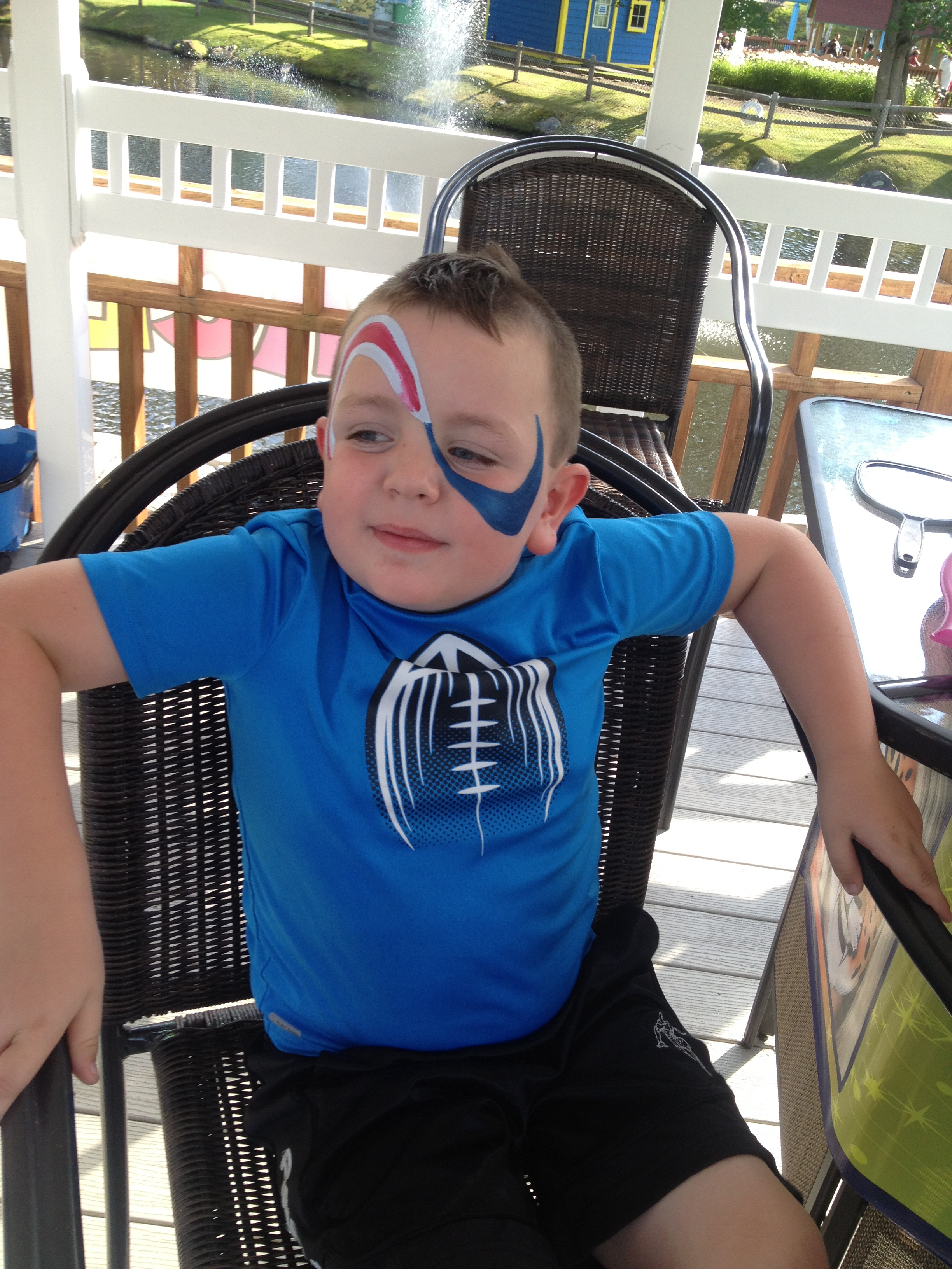 This summer our family traveled up to Storyland. The boys and their cousin Mackenzie saw multiple kids throughout the day with painted faces. They kept asking to have their faces painted too. How could we pass this up? They had a few boards set up outside of the face painting area, and you were supposed to find the “face” you wanted and then tell the painters. The kids were ecstatic. Mackenzie chose the “Rock Princess” and posed like a supermodel as she sat and had her face painted with beautiful pinks, whites and sparkles. Jameson chose a red, white and blue swoosh that reminded him of Captain America.  (I think he may have been a little scarred from his previous bear experience and didn’t want to have his entire face painted. Instead, he opted for the simple swoosh around his eyes.) And then Jackson chose the face he wanted. My husband and I tried to sway him towards a pirate or the rocker, who had simple designs around the eyes and mouth, but he had other plans. He chose the “Tiger” – a face full of orange ad black paint – and would not budge. He was insistent. It was quite comical how firm he was on his decision. I never thought for a second that he would sit long enough to have his entire face covered, but he was a pro.