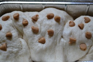 5. Place the dough roll in a greased bread pan. I used a disposable pan because I didn’t want any dishes.