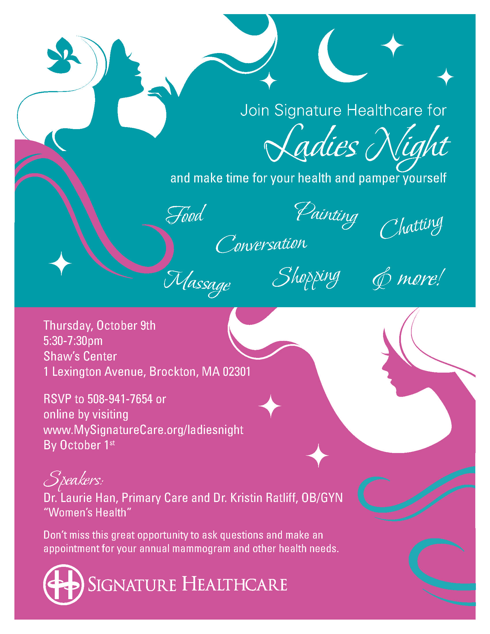 Want a night off from your typical household and parenting duties? Grab a few girlfriends and join Signature Healthcare for Ladies Night on Thursday, October 9th from 5:30 – 7:30 p.m. at Shaw’s Center in Brockton!