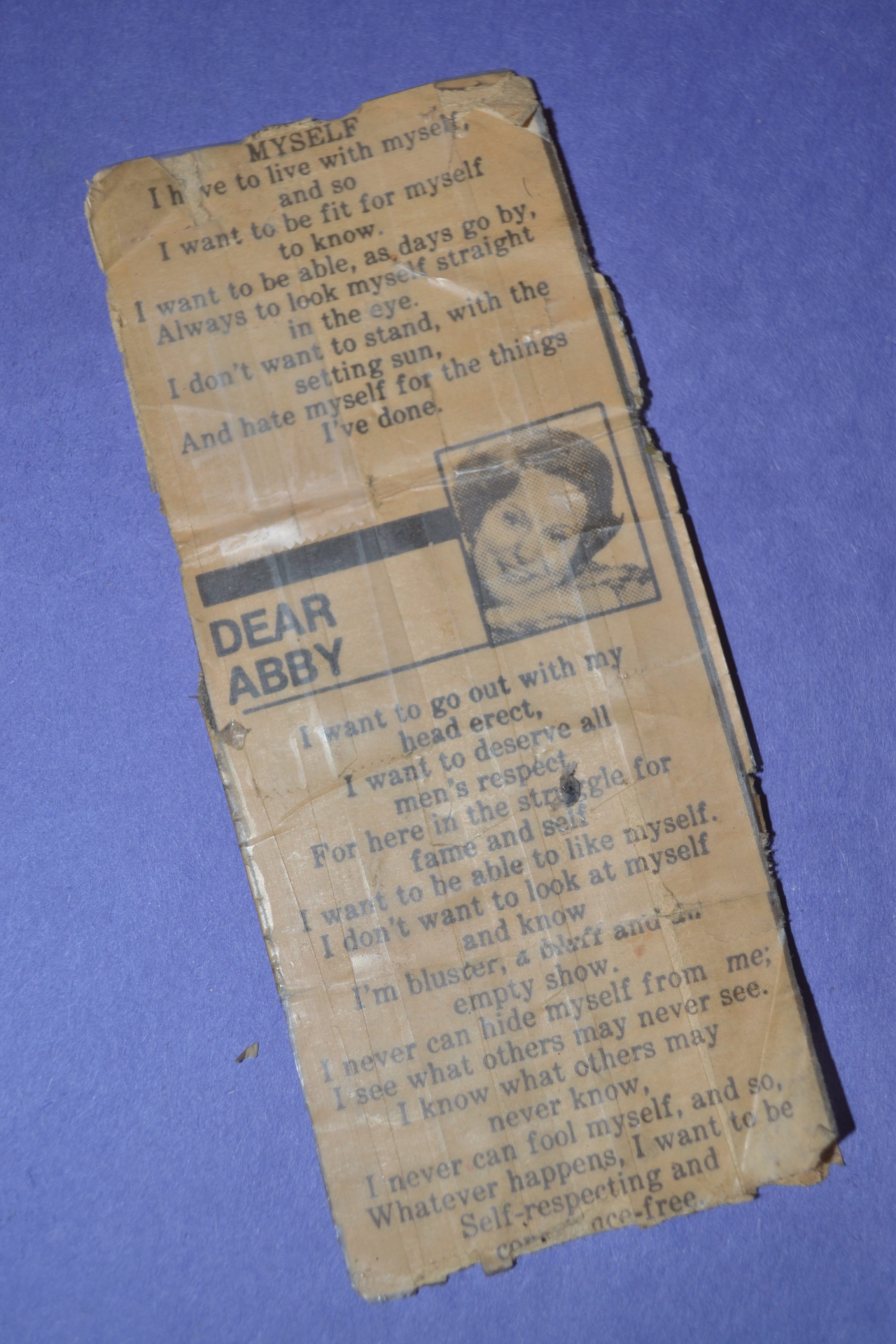 About a month ago, I was on the hunt for something in the cluttered hallway closet. I stumbled across a special keepsake. My mom always carried a certain newspaper clipping in her wallet. It was a Dear Abby poem entitled, “Myself.” I’ve had in all these years and often carried it in this bag pocket or my wallet, but it had gotten lost in the shuffle at some point. Seeing it there made me smile. It’s in rough shape but, despite it being covered in tape, I’ve tucked it back into my wallet. The message is just the kind of pick me up I need right now in my life.
