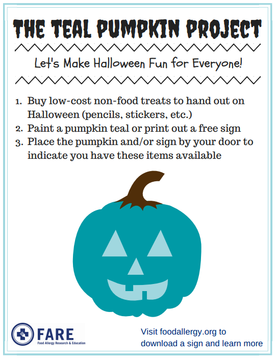 Want to participate? Simply paint a pumpkin teal (the color of food allergy awareness) and place it on your porch. You can also print out a sign to indicate that your house has non-food treats available.